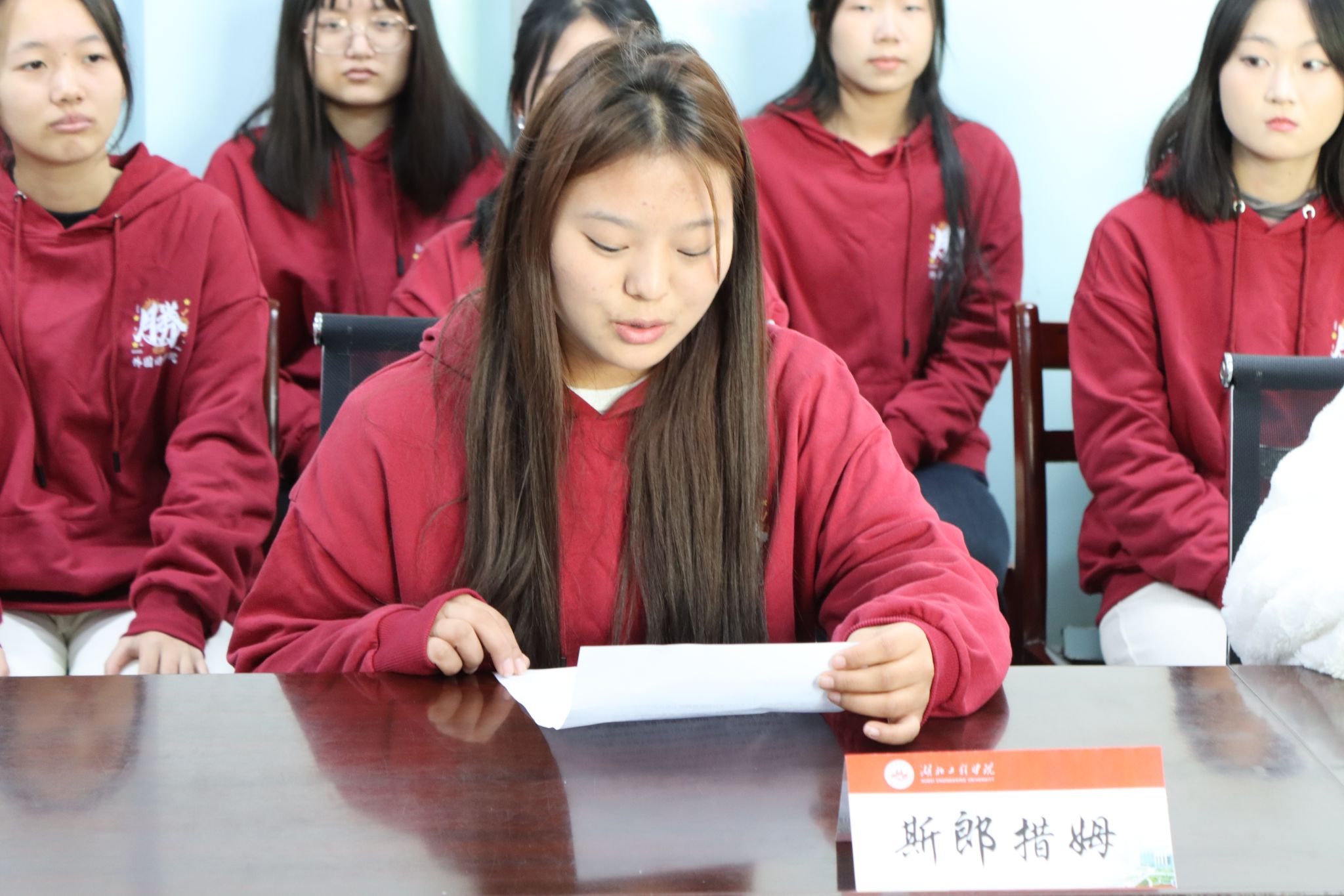 辅导员白思冉老师向张磊员工介绍了措姆同学的基本情况与在校学习表现,表示将持续关注员工发展,为措姆和同学们的学习成长提供一切必要帮助和支持。
