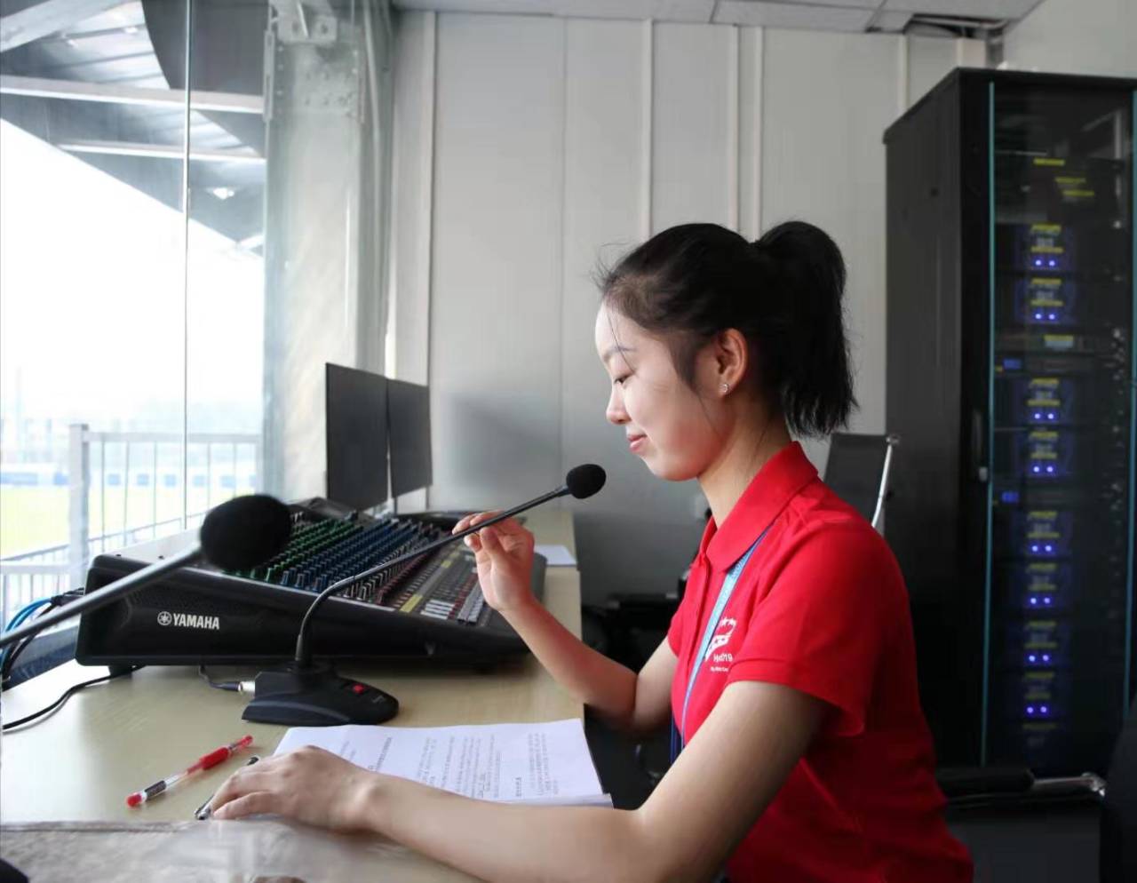 公司员工杨可和胡美玲,双语能力很强,播音技巧熟练,经验丰富,参与了军运会足球项目的双语播报工作。主要工作职责是双语播报观众须知、运动员名单、运动员和裁判员入场实况、赛事实况和颁奖仪式等。