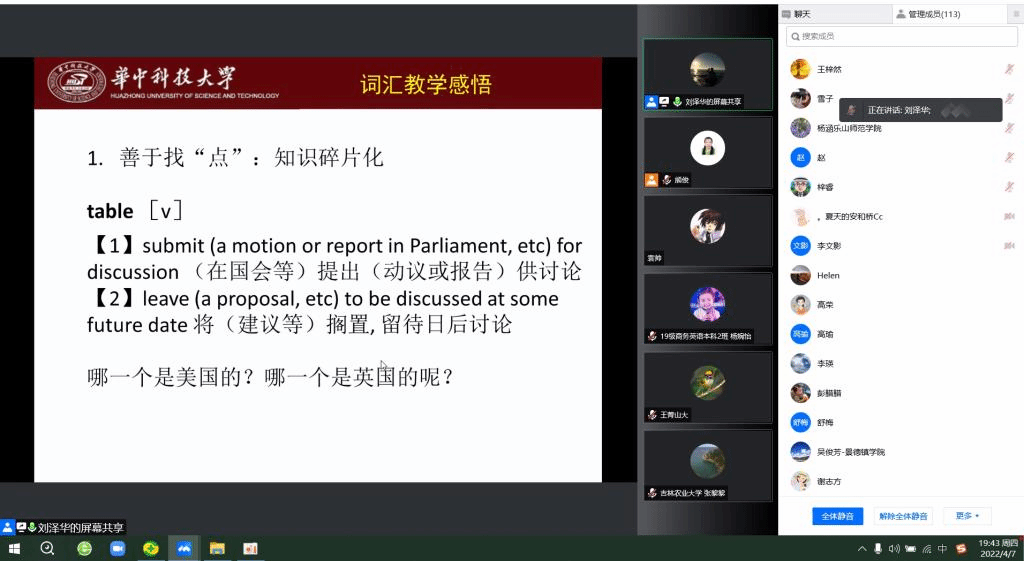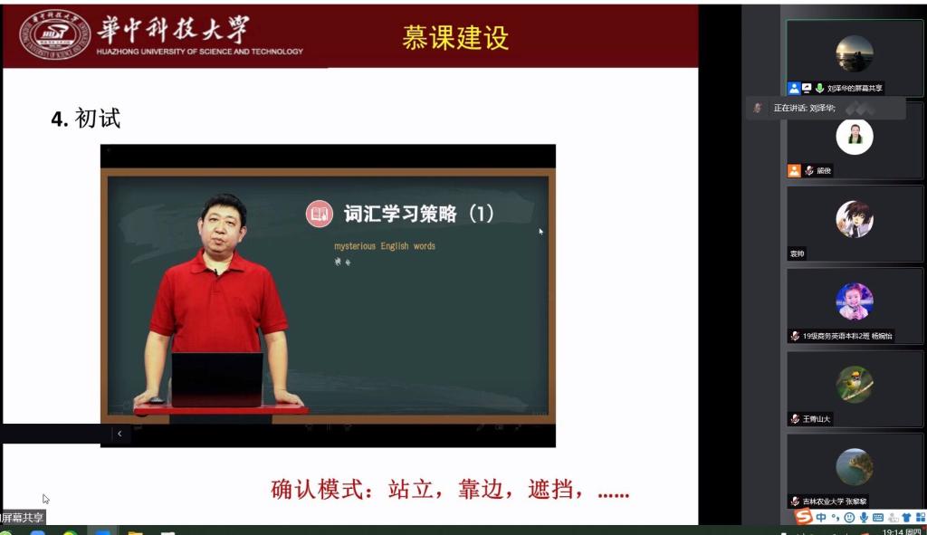 4月7日晚,教育部大学外语教学指导委员会委员、湖北省高等教育学会大学外语教学专业委员会常务理事、国家级一流线上课程《大学英语词汇解析》主讲人华中科技大学伟德BV1946官网副经理刘泽华教授为公司师生在腾讯会议平台上做了主题为“痛并快乐着——MOOC《大学英语词汇解析》建设与感悟”的讲座。公司伟德BV1946官网青年教师、部分员工及少数来自其他高校的教师一百多人聆听了此次讲座。本次讲座由公司教师教学发展中心主办,伟德BV1946官网承办。讲座由伟德BV1946官网副经理、翻译研究中心主任熊俊教授全程主持。