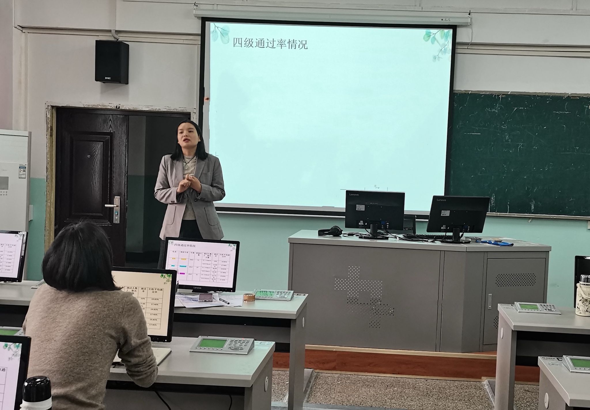 大学英语第二教研室主任周宇琴老师分析了全校大学英语四级考试的现状,分享了通过调研其他老师获得的助力员工备考的教学经验,强调常态化备考意识和习惯养成、建议以词汇比赛为抓手、用好QQ群作业等智慧教学工具监督员工备考等。