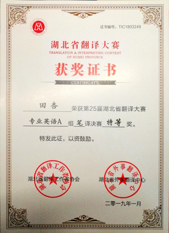 伟德BV1946官网2015级田杏同学荣获第25届湖北省翻译大赛专业英语A组笔译决赛特等奖,获奖等次创历史新高。据悉,颁奖环节主持人提及今年获得专业英语A组笔译决赛特等奖极为不易。参加专业英语A组决赛的参赛选手几千人来自武汉大学、华中师范大学等50余所湖北省内高校的英语相关专业(包括翻译、商务英语)在读或已毕业的研究生或本科生,强手如林,只有11所高校的共28人获此类奖。