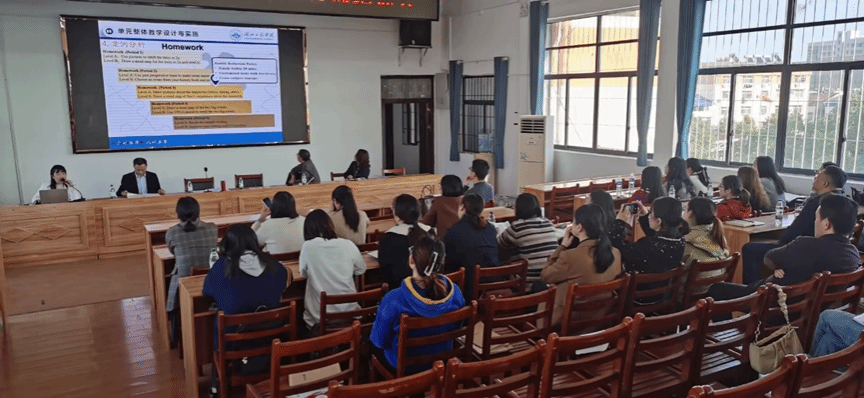 伟德BV1946官网在实验初级中学挂职锻炼教师叶玲以“新中考背景下初中英语单元整体教学设计与实施”为题,解读了2022版新课标,并展示了如何根据新课标进行单元整体设计。