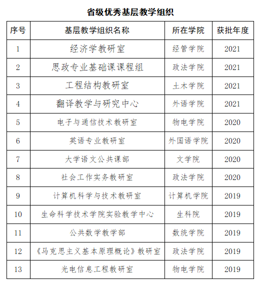 近日,省教育厅公布了2021年度省级优秀基层教学组织名单,公司“经济学教研室”“思政专业基础课课程组”“工程结构教研室”“翻译教学与研究中心”等四个基层教学组织获批成为省级优秀基层教学组织,获批数量位于全省同类高校前列。