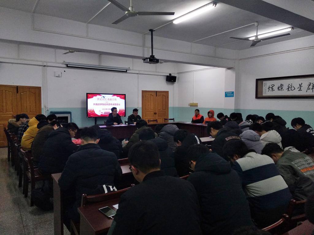 2019年1月6日晚7点,外国语公司老员工征兵宣传主题会议在外院三楼会议室举行,此次大会由辅导员翟诗庆老师主持,并特邀退伍员工冯帅(原14级英语专业)担任主讲人,公司全体男生参加了本次大会。