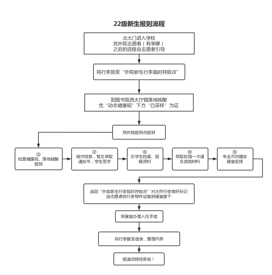 1、自8月29日起,新生每日填写《2022级新生健康监测及活动轨迹记录表》,凭“48小时内核酸检测阴性证明”、“通信行程卡”绿码截图和“健康码”绿码截图申请来校报到。