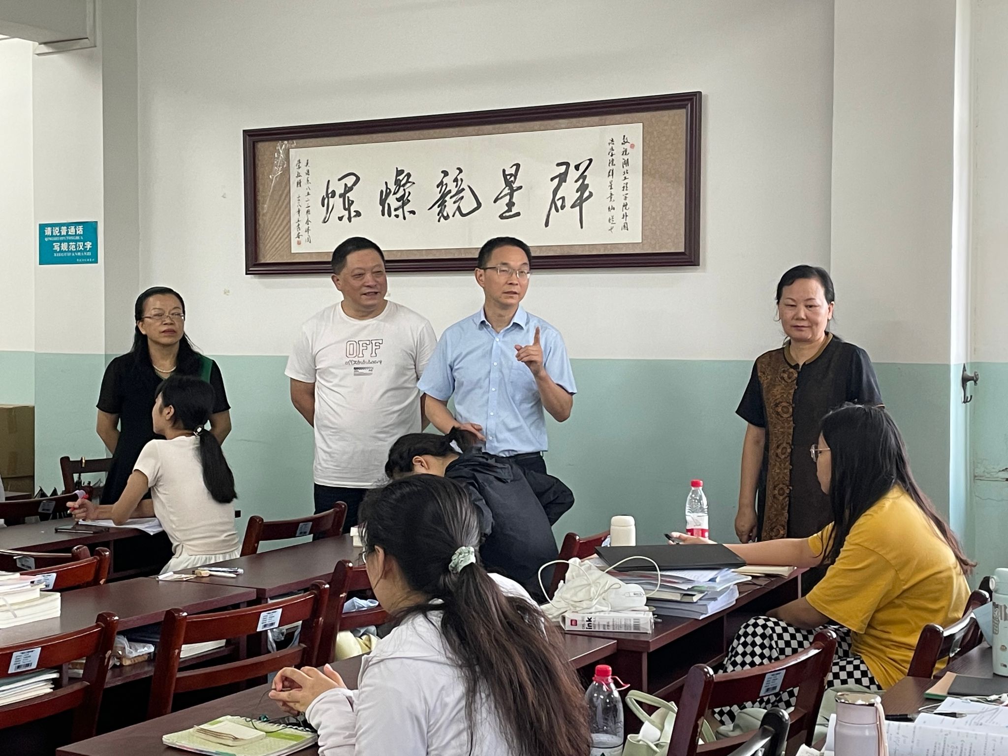 7月31日下午,经理操时尧、公司党委书记吴建、副经理郑红艳、副经理熊俊、院办主任张敏仙及辅导员老师一行,到外院考研自习教室看望备考员工。