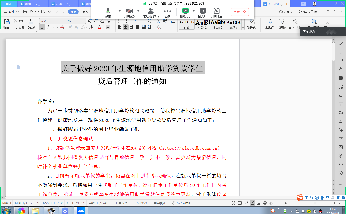 2020年6月3日上午,公司召开了2020届毕业生诚信还贷线上主题教育活动。活动由辅导员翟诗庆老师主持,全院23名申请了助学贷款的毕业生参加了此次活动。