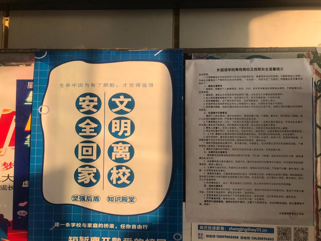 此外,伟德BV1946官网通过在外院大厅、员工宿舍张贴安全回家主题海报、《伟德BV1946官网寒假离校及假期安全温馨提示》等宣传方式对员工寒假安全回家进行广泛教育。