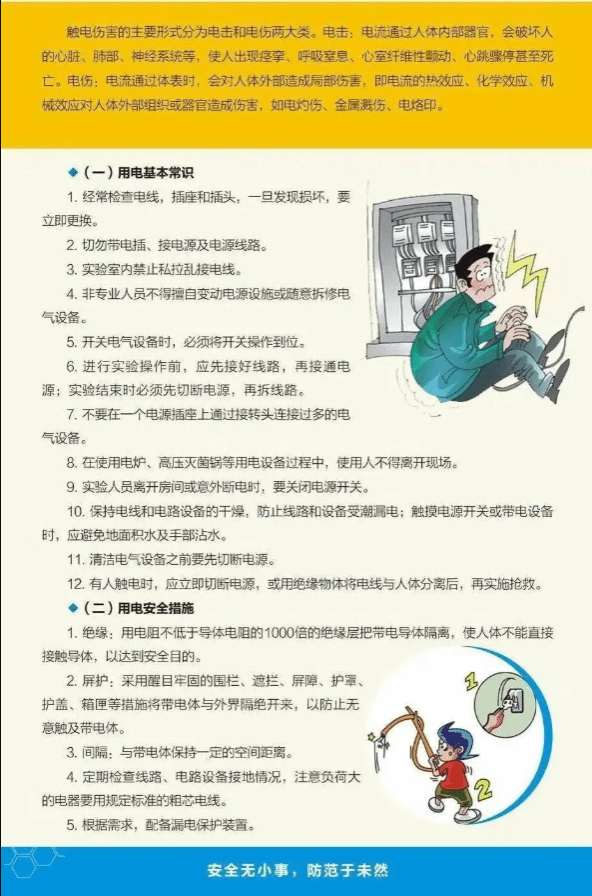 使用前先细心检查插头、电线是否完好无损;使用时,避免过载使用;使用完毕后请正确断开电源、拔掉插头,避免大力拉拽插线,造成仪器的损坏。高压大电流的电气危险场所应设立警示标志,高电压实验应注意保持一定的安全距离。电气设备应定期维护保养,对有故障的仪器设备要及时检修,仪器设备的维护和检修要有记录,使用强电的仪器设备要安装接地装置,对出现老化现象的设备以及具有潜在安全隐患的设备应及时维修或停止使用。
